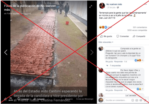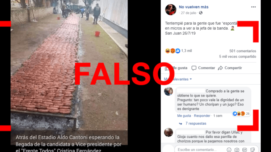 El 26 de julio último, Fernández de Kirchner encabezó un acto en el estadio Aldo Cantoni, en la provincia de San Juan, en el oeste del país. En los más de 500 comentarios de la entrada que se volvió viral, los usuarios expresan su indignación por la supuesta prueba de que quienes asistieron al evento no lo hicieron por convencimiento, sino a cambio de choripanes.