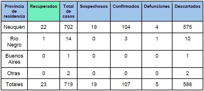 En la provincia de Neuquén se registraron 107 casos positivos, 22 personas recuperadas y cuatro muertes.
