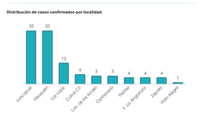 33 casos se contabilizaron en las ciudades de Neuquén capital y Loncopué, 13 en Las Lajas, 6 en Cutral Co, 5 en San Martín de los Andes y Centenario, 4 en Plottier, Villa la Angostura y Zapala y 1 en Vista Alegre.