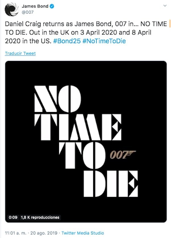 «Daniel Craig regresa como James Bond, 007 en… NO TIME TO DIE. Estreno en el Reino Unido el 3 de abril de 2020 y el 8 de abril de 2020 en los Estados Unidos», afirmaron en Twitter poniendo fin a meses de incógnita.