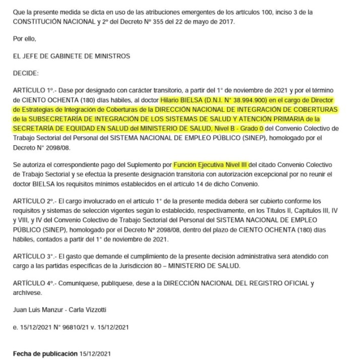 De acuerdo al documento, al que tuvo acceso la agencia Noticias Argentinas la designación de Bielsa se daría con carácter transitorio, a partir del 1° de noviembre de 2021 y por el término de ciento ochenta días hábiles, por un salario mensual de 215.434 pesos.