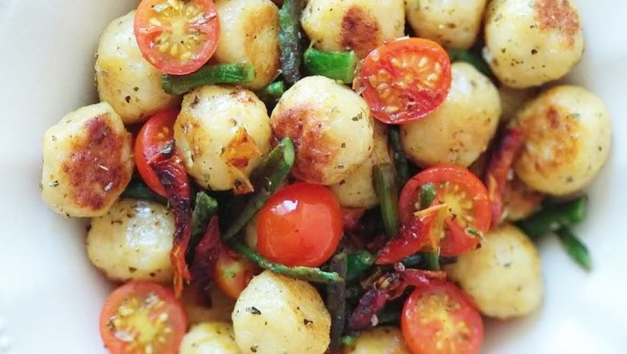 Poner agua a hervir con sal en una olla. Allí cocinar los ñoquis, que suben enseguida y con espumadera retirar y veter en una sartén que debe estar al fuego con aceite de oliva, tomates cherrys, tomates secos ya hidratados. Los ñoquis se tostarán un poco y esta ok, es la forma que propongo que los pruebes. Agregar albahaca y pimienta o sal si hace falta.