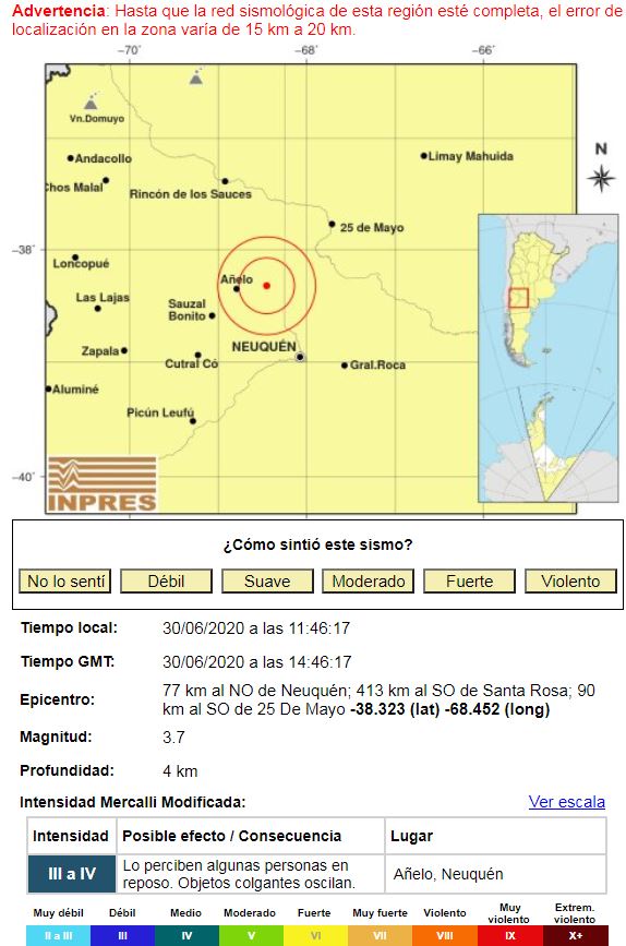 Según el Inpres, el sismo tuvo una magnitud de 3,7°. Si bien no es un valor alta en la escala general de sismos, sí se encuentra entre los que se registran con mayor valor en la zona. Muchos son más cercanos a los 2,5° y suelen ser informados por un grupo de especialistas del la Red Geocientífica Chile, quienes estudian desde hace varios años la sismicidad neuquina. Oficialmente, el organismo nacional aclaró que no publica los sismos de esa magnitud o menores por un acuerdo de confidencialidad con el Gobierno provincial.