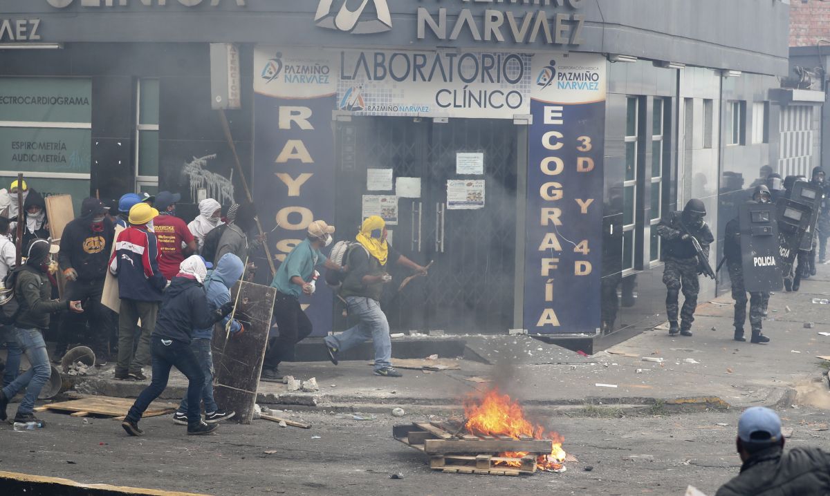 Manifestantes volvieron a enfrentarse hoy con la policía en Quito en el décimo día de protestas que encabezan los indígenas contra ajustes económicos pactados por el gobierno de Lenín Moreno con el FMI.
