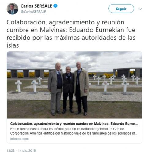 La polémica se generó el viernes pasado, cuando Sersale publicó un tuit sobre la visita del empresario Eduardo Eurnekian a Malvinas, donde se reunió con Roger Spink, miembro de la Asamblea Legislativa de las islas, y Mark Kent, embajador del Reino Unido en la Argentina. “Colaboración, agradecimiento y reunión cumbre en Malvinas: Eduardo Eurnekian fue recibido por las máximas autoridades de las islas”, escribió Sersale, que a los pocos minutos corrigió su mensaje, pero la polémica ya se había generado.