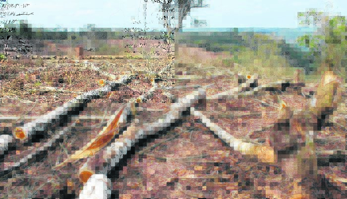 Se acaban de desmontar centenares de hectáreas. El proceso de desmonte es brutal y no hay sutilezas: para limpiar una parcela, en la mayoría de los casos se usan dos topadoras separadas decenas de metros entre sí y entre ellas se tensa una gruesa cadena que, de forma literal, arranca y derriba todo a su paso al avanzar las máquinas. Como en las películas de guerra, el lugar queda lleno de restos apilados, aplastado, polvoriento y en silencio.