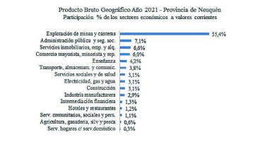 En el gráfico se observa una malformación en la estructura económica neuquina. El sector de Minas y Canteras (incluye petróleo y gas) es el mayor y representa el 55,4%. El segundo más grande es la Administración Pública con 7,1%, seguido de los Servicios Inmobiliarios con 6,6%. Mientras la Industria Manufacturera sólo alcanza el 2,9%; y el sector Agropecuario apenas un 0,6% del total.