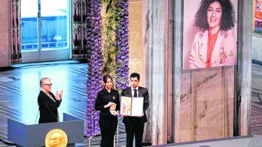 Sus mellizos de 17 años, Ali y Kiana, vestidos de negro, aceptaron el premio durante la ceremonia en el ayuntamiento de la capital de Noruega y leyeron un discurso que logró transmitir desde la cárcel.
