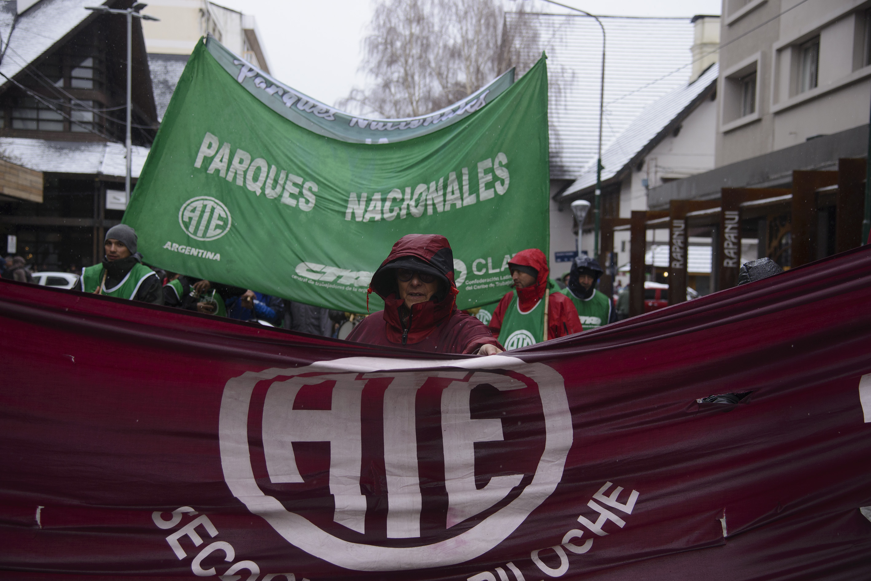 Organizaciones sociales y el gremio ATE se movilizaron esta mañana en el centro de Bariloche, como parte de la jornada nacional de protesta, bajo condiciones adversas del tiempo y fuertes precipitaciones de lluvia y nieve.