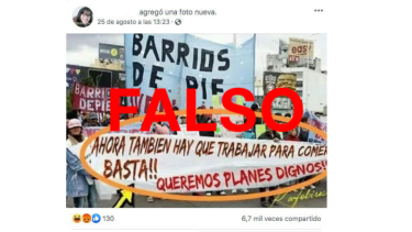 La foto real fue publicada en mayo de 2017 por el diario El Cronista, pero fue manipulada para cambiar el texto del cartel. Originalmente decía: “Nunca más hambre. Emergencia…”. En aquel momento, los manifestantes reclamaban la sanción de una ley de emergencia alimentaria. La imagen trucada ya había sido viral en 2018 y ahora, con una nueva publicación en Facebook, fue compartida más de 6.700 veces.