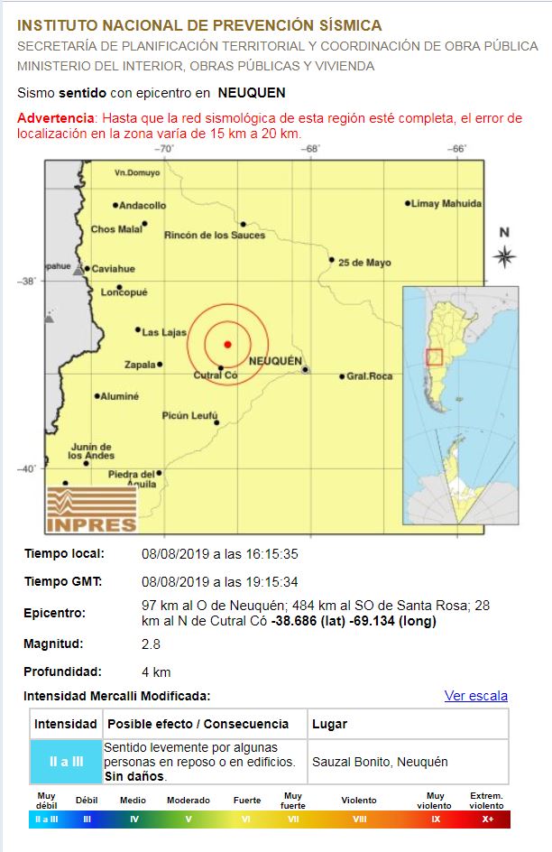 Instituto Nacional De Prevención Sísmica (INPRESS) registró un sismo de 2,8 de magnitud a una profundidad de 4 kilómetros. El epicentro fue a 10 kilómetros al S-SO de la localidad