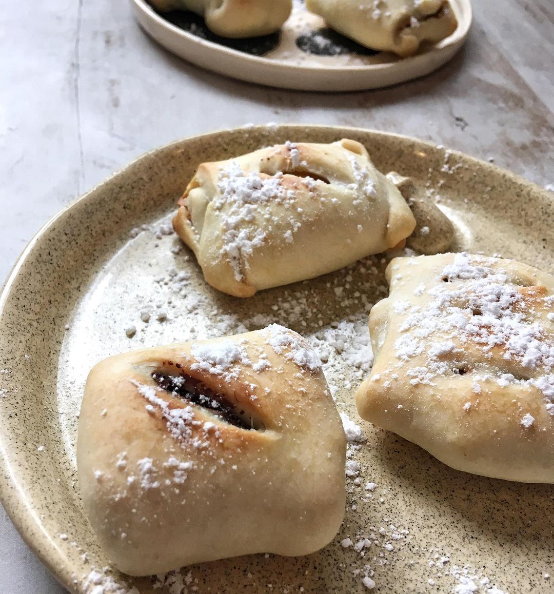 Cortá rectángulos del tamaño que quieras. A cada rectángulo untalo con mantequilla de maní (si querés) y ponele arriba un cuadradito de chocolate. Cerralo tipo pañuelo: los dos extremos largos para adentro y después los dos cortos. Del otro lado le podés hacer un corte así se ve el relleno. Llevalos a una placa para horno aceitada y cocinalos a fuego medio hasta que estén dorados.