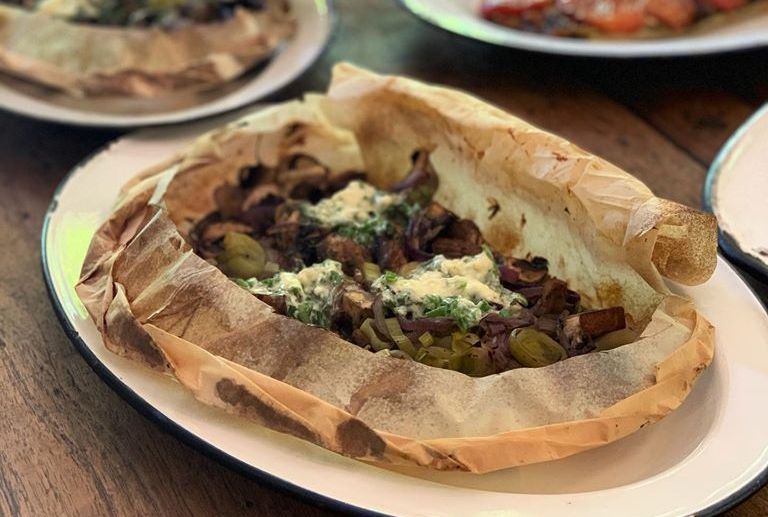 Filetear los ajos, hongos, puerro y cebolla. Mezclar con perejil, ciboulette, sal y pimienta. Colocar en una mitad del papel la mezcla de hongos. Salpimentar y cerrar el papel con un repulgue, como si fuera una gran empanada. Llevar a horno medio por 15 a 20 minutos. Para servir, cortar el papel y enrollarlo. Por úlitmo agregar un poco de la crema de mascarpone en caliente y servir.