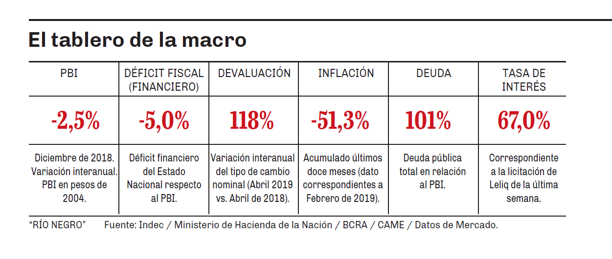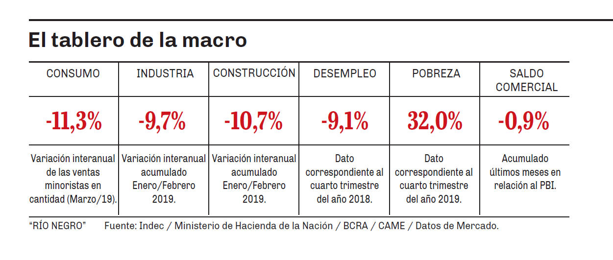 Lo que justifica el viraje pragmático, son los datos que arroja el tablero de la macroeconomía (ver infograma). El primer trimestre de 2019 no ofreció un solo registro positivo en relación a la economía. El conjunto de las variables revela que tanto las empresas como los consumidores (principales motores de la demanda agregada), viven un momento crítico.