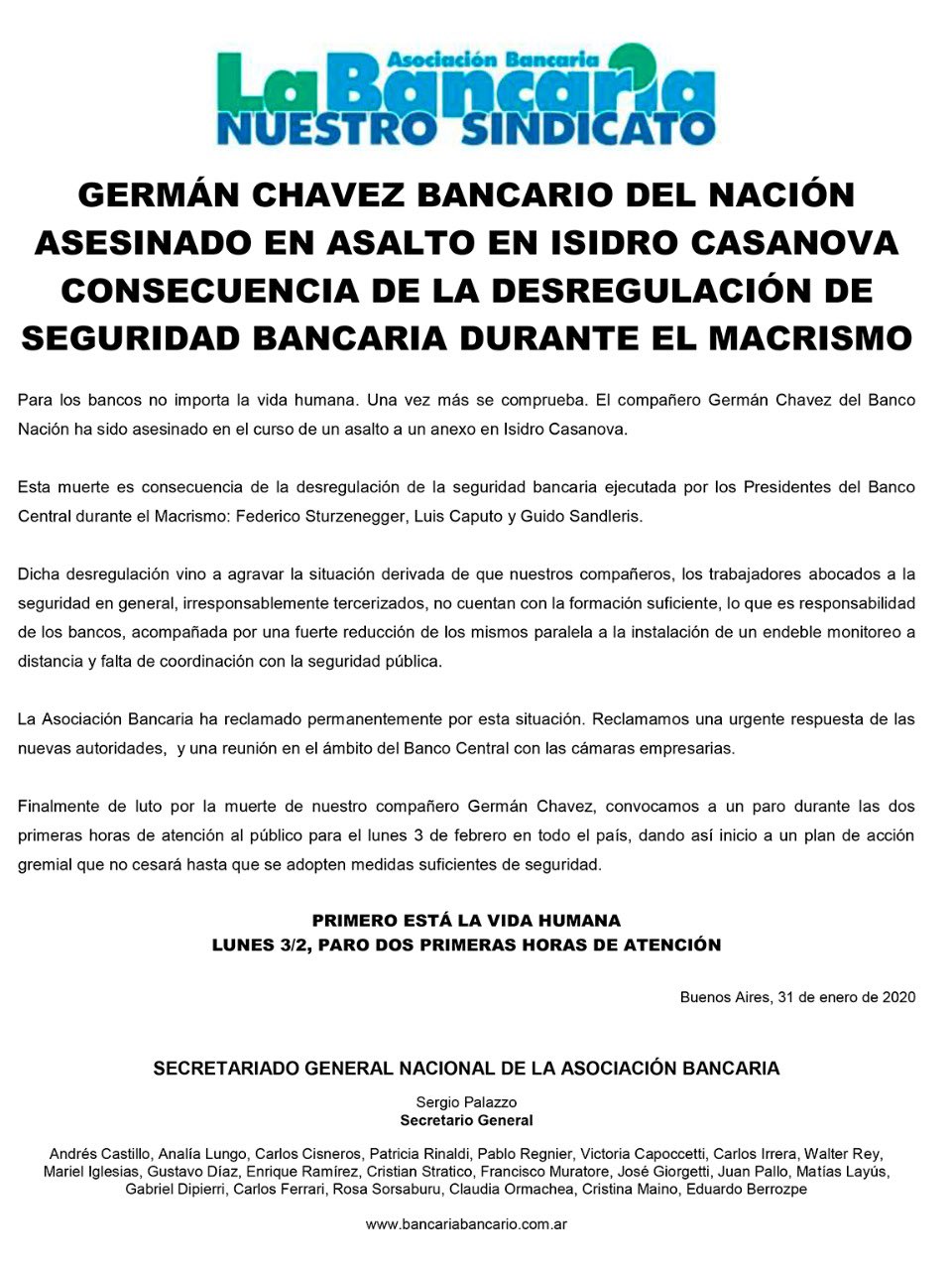 Paro bancario de dos horas el lunes por el homicidio de un cajero