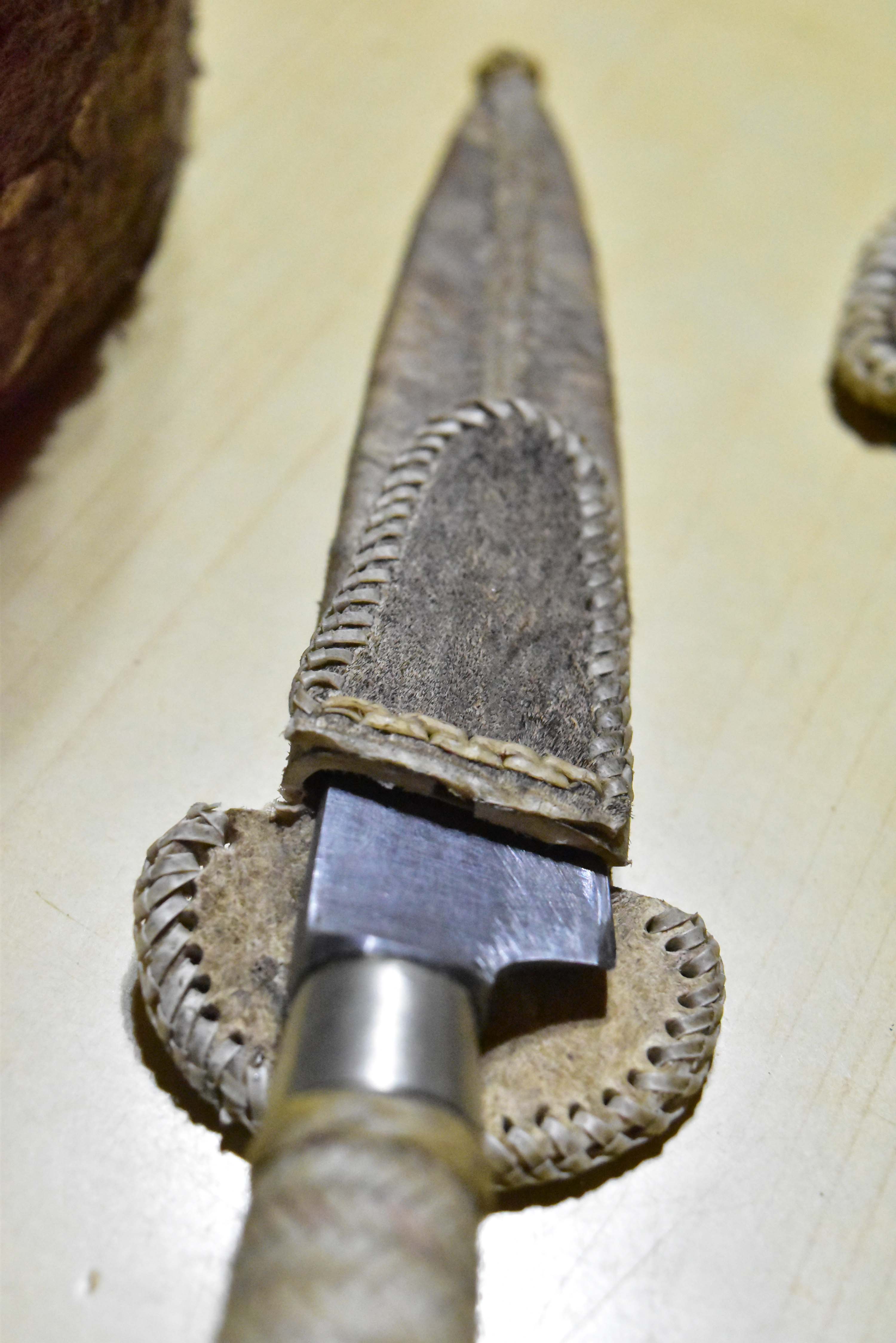 De la misma forma con los cueros de potro, liebres mara, chivos o corderos, de donde saca los tientos para las empuñaduras de los cuchillos o los que utiliza a la hora de coser, unir partes o tejer.
