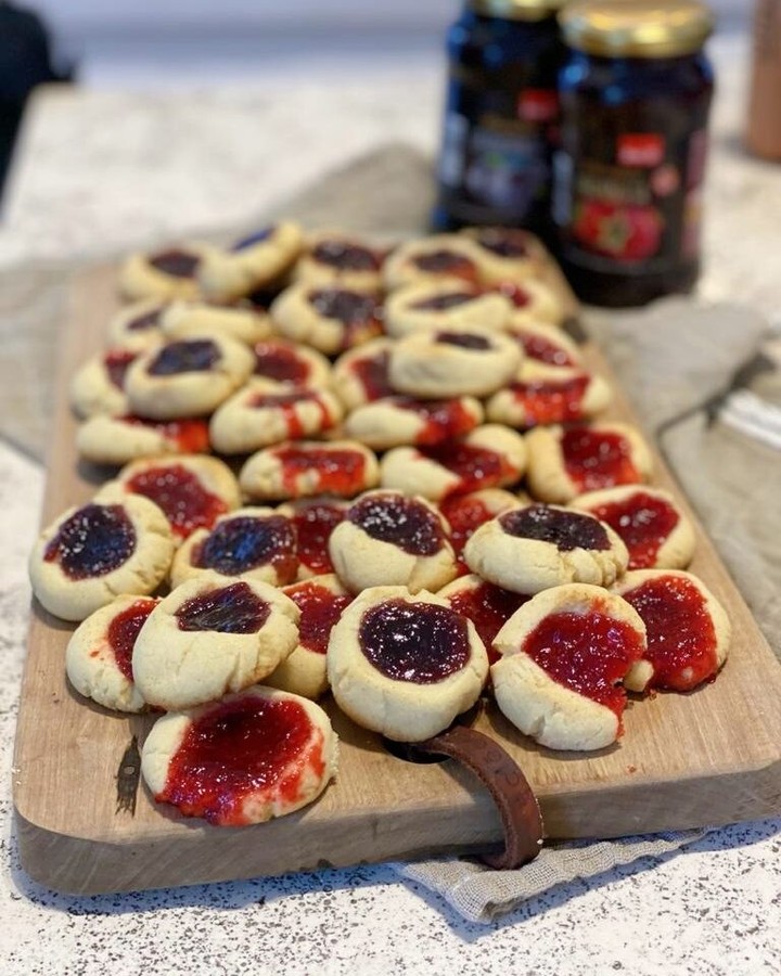 Batí en un bol grande, la manteca blanda, el azúcar y la esencia. Agregá las yemas e integrá. Agregá la harina y el polvo para hornear hasta forma una masa que no se pegue en los dedos. Colocá la masa en la mesada y amasá. Forma cilindros, cortá rodajas, formá bolitas y colocalas en una placa. Con el dedo gordo presiona en el centro formando un pocito, ahí es donde vas a poner la mermelada. Colocá una cucharadita de la mermelada que hayas elegido. Llevá a horno precalentado a 180°C por 10 a 15 minutos aproximadamente.
