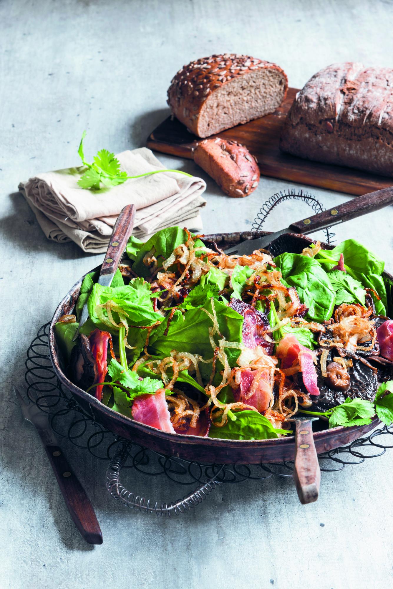 Disponer la espinaca en una fuente. Colocar encima los hongos con su líquido de cocción. Distribuir luego las cebollas y la panceta. Decorar con el cilantro.