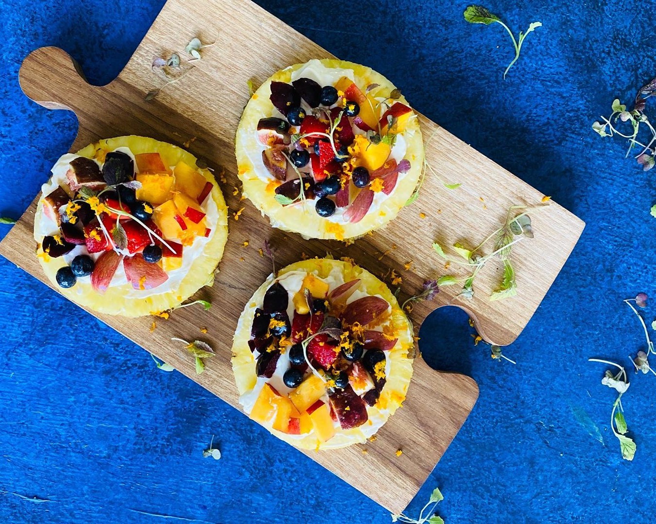 La receta arranca así: ananá cortada en rodajas sin piel, yogur untado por encima (el que solés utilizar), si se desparrama en el plato por ser más líquido, no pasa nada. Si conseguís griego, podrías usar de coco o variantes veganas.