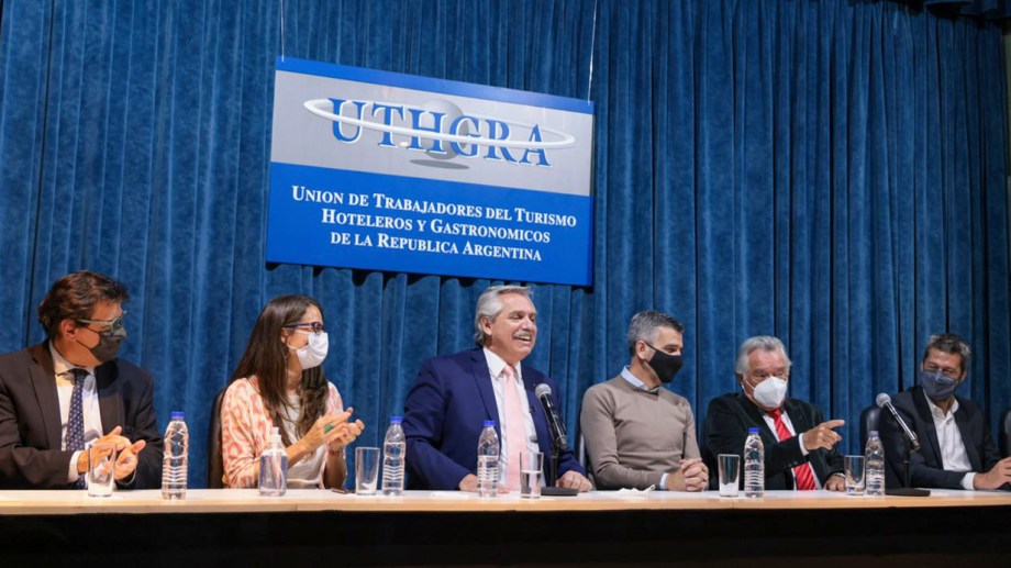 El acto se desarrolló esta tarde en la sede de UTHGRA, el sindicato que conduce Luis Barrionuevo, quien ofició de anfitrión del evento. Además de los presidentes de distintas cámaras empresarias del sector gastronómico y hotelero, Alberto sentó en el escenario a los ministros Claudio Moroni (Trabajo), Zabaleta (Desarrollo Social), Elizabeth Gómez Alcorta (Mujeres, Género y Diversidad) y Matías Lammens (Turismo).