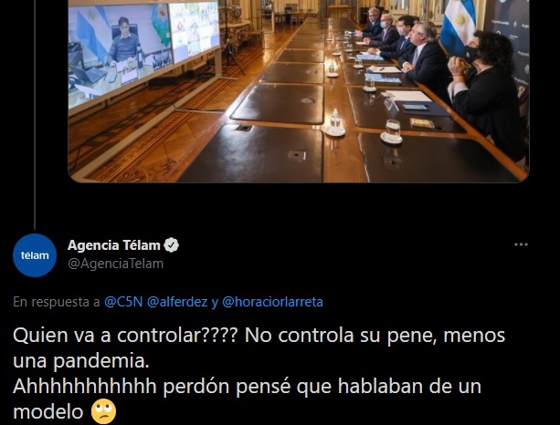 “Quién va a controlar, no controla su pene menos una pandemia. Ah perdón, pensé que hablaban de un modelo”, se publicó desde la cuenta de la agencia de noticias.