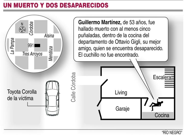 El caso que ayer conmocionó a los vecinos de Roca todavía guarda muchos puntos oscuros. Se sabe que el cuerpo de Martínez, de 53 años, apareció tirado en la cocina de la casa de Ottavio Gigli, de 52, ubicada en la calle Córdoba 991, a metros de la intersección con Alsina. Tenía cortes profundos en el pecho y en el abdomen y otra puñalada en la espalda, reconoció la jueza Margarita Carrasco, a cargo de la causa.