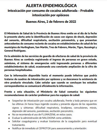 El Ministerio de Salud de la provincia de Buenos Aires emitió esta tarde un alerta ante la identificación de casos con signos de shock, depresión del sensorio, dificultad respiratoria, excitación psicomotriz, y que presentan antecedentes de consumo reciente de «cocaína adulterada».