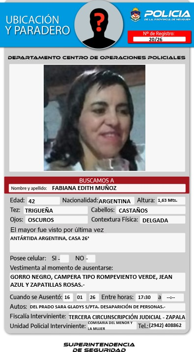 La Policía de la Provincia de Neuquén, a través del Departamento Centro de Operaciones Policiales, emitió una alerta de “Ubicación y Paradero” bajo el registro N° 20/26.