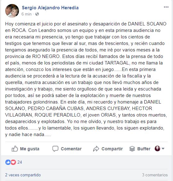 Minutos después de las 8, llegó al auditorio Gualberto Solano -padre del joven trabajador desaparecido- acompañado de uno de sus abogados. En un breve diálogo con “Río Negro”, Solano declaró: “Luché seis años y medio, quiero encontrar el cuerpo de mi hijo y llevarlo”. Además insitió en la hipótesis de que a su hijo lo mataron porque hizo un reclamo laboral.