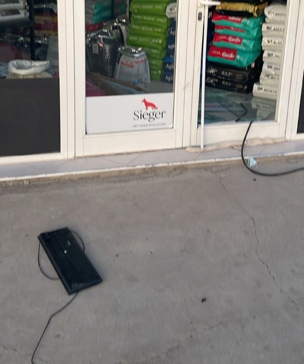 En un local de venta de alimentos para mascotas de calle La Plata había una puerta de vidrio rota con una caja registradora, una balanza de precisión digital y un router, entre otros elementos, tirados sobre la vereda. Al llegar el propietario del comercio reconoció los elementos sustraídos.
