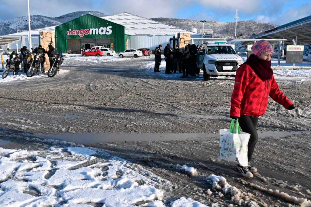 En el exterior del supermercado Changomás, una quincena de uniformados se apostaron en el exterior de la playa de estacionamiento y junto a la puerta, otro grupo menor de policías resguardan el comercio del Alto de Bariloche.