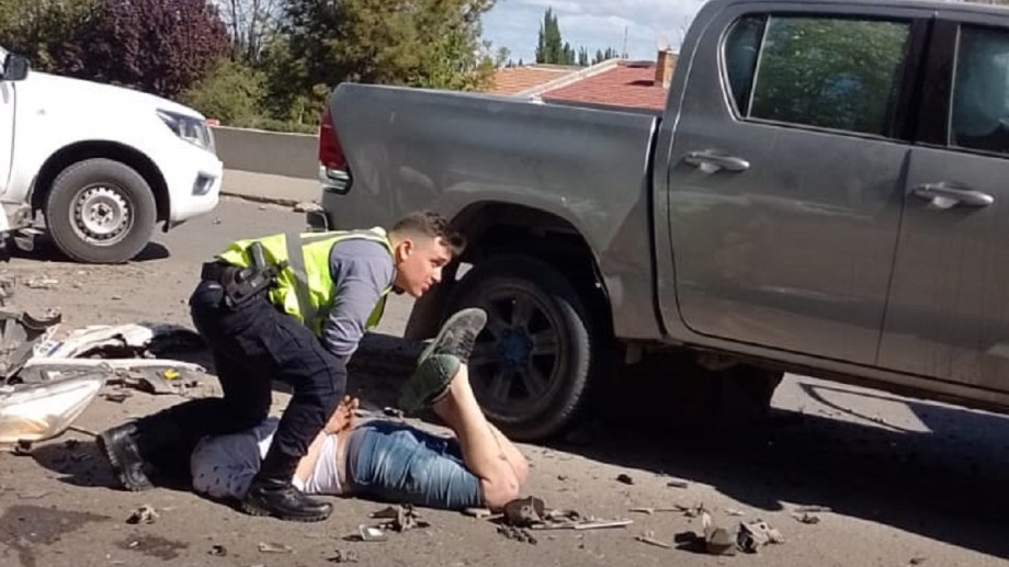 Distintos conductores que circulaban por el lugar registraron el hecho en el que se vio cómo el vehículo impactó contra un patrullero. «Nos pasó una camioneta por la multitrocha, llegando a Cipoletti por esa autovía, iba sin patente y estaba chocada adelante«, explicaron.