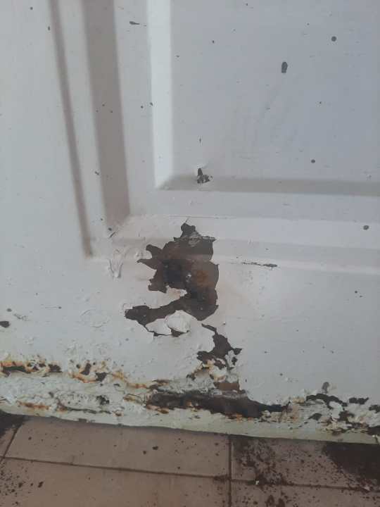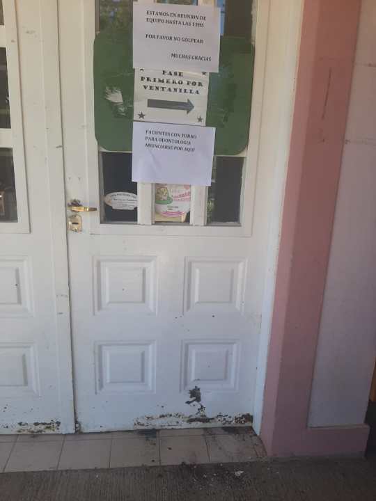 «En eso, se baja el hijo del auto y empieza con insultos, improperios y amenazas, descalificando a las instituciones y diciendo que nunca los atendemos. Cuando la mujer empieza a empujar la puerta, le digo que voy a llamar a la policía y al intentar cerrarla, mi compañera me grita que tenga cuidado. Escucho un golpe fuerte y quedé shockeado», aseguró. La mujer había arrojado un cascote enorme que impactó en la parte de abajo de la puerta.