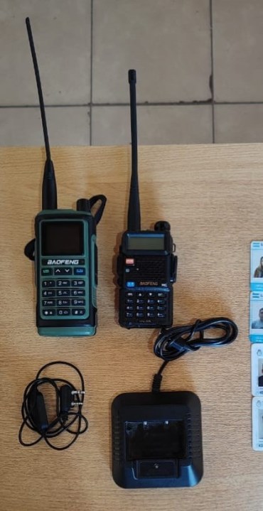Los aparatos, marca Baofeng, estaban apagados. Uno de ellos carecía de batería y el otro mostraba batería baja. También se hallaron una base cargadora y un cable de manos libres.