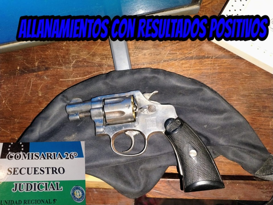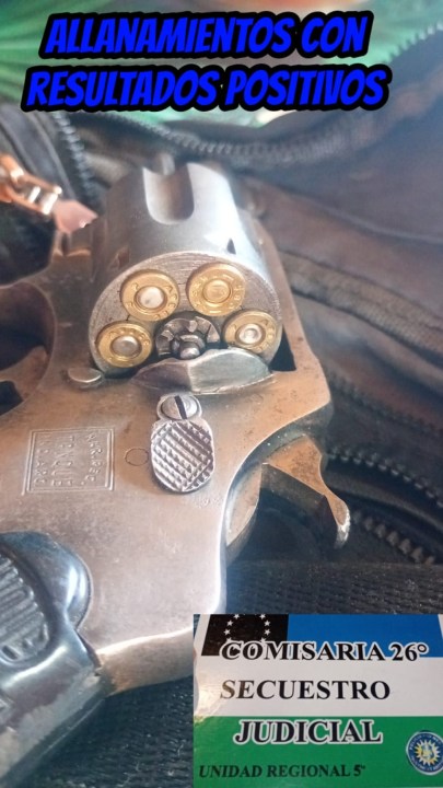 Durante el procedimiento en el primer domicilio, los efectivos secuestraron un revólver calibre 32 marca Tanque. El arma contenía en su tambor cinco municiones y una vaina servida. El secuestro fue realizado por personal del Gabinete de Criminalística.