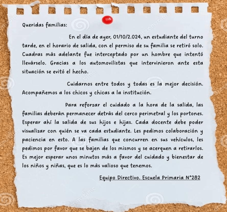 A raíz del hecho, el equipo directivo de la Escuela 282 emitió un comunicado para solicitar a las familias que tengan recaudos a la hora de retirar a los alumnos. Además, aclararon que el estudiante atacado había abandonado el establecimiento «con el permiso de su familia».