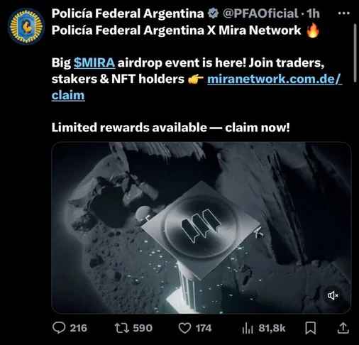Durante el hackeo, se difundieron posteos que decían: “Policía Federal Argentina Х Mira Network, Big $MIRA airdrop event is here! Join traders, stakers & NFT holders. Limited rewards available — claim now!”. Se trataba de una supuesta moneda virtual identificada como $MIRA, promocionada como evento de recompensas.