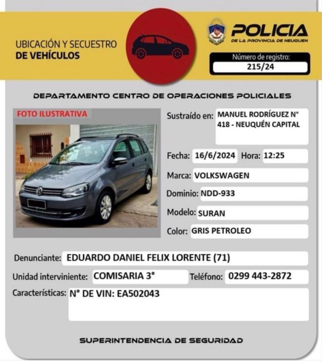 Cualquier dato o información sobre el paradero del vehículo puede ser comunicado directamente al teléfono de la comisaría Tercera al numero 299 4432872.