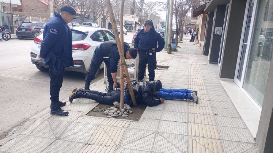 Los agentes dieron la voz de alto, y ambos hombres comenzaron a correr por calle San Martín en dirección este-oeste, dando inicio a una persecución. Los sujetos tomaron calle 25 de Mayo en sentido norte-sur, donde fueron detenidos a medio camino antes de llegar a la intersección con Fernández Oro.