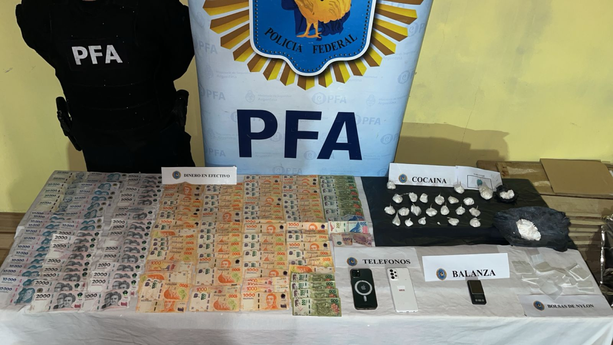 Además, se incautó casi medio kilogramo de cocaína de máxima pureza, un total de $553.000 pesos argentinos en efectivo, una balanza digital, elementos de fraccionamiento y dos teléfonos celulares.