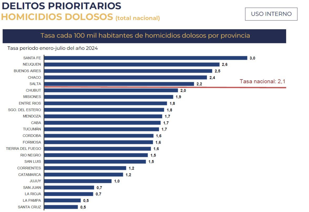 En concreto, el gráfico difundido por la funcionaria nacional en su red social «X», describe que sobre un número de 100 mil habitantes, Neuquén tiene una tasa de homicidios dolosos de 2,6. Por debajo de Santa Fe con el 3,0 y sobre Buenos Aires con el 2,5.