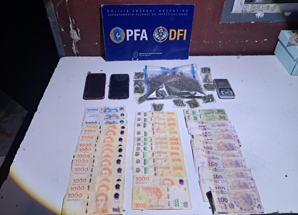 Además del estupefaciente procesado, se hallaron 7 plantas de Cannabis sativa, una suma considerable de dinero en efectivo —presuntamente fruto de las ventas ilícitas— y una balanza digital de precisión. También se secuestraron dos teléfonos celulares que serán clave para peritajes futuros.
