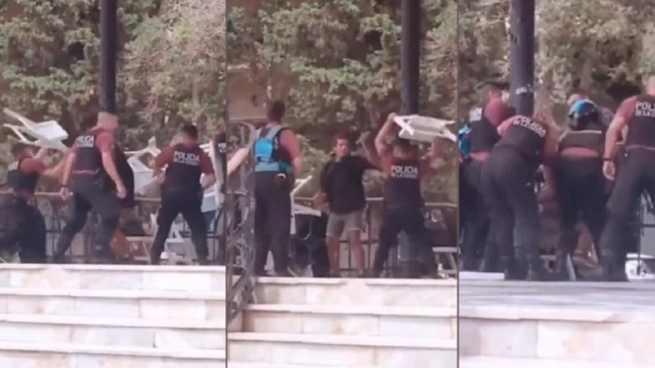 Allí se observa como efectivos de la Comisaria Vecinal 13A tratan de reducir al sujeto golpeándolo con sillas de plásticos hasta que logran detenerlo.