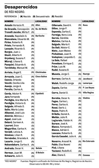 *Fuentes: Registro Unificado de Víctimas del Terrorismo de Estado de Río Negro (actualizado a marzo de 2025), Conadep, Secretaría de Derechos Humanos de la Nación, investigación del Observatorio de Derechos Humanos de Río Negro y Unter. Los casos pueden variar entre registros; todos continúan en construcción y permanecen abiertos.