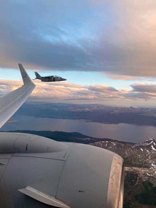 El avión que trasladaba a la comitiva aterrizó a las 20.20, informaron fuentes oficiales, y fue escoltado por aviones Pampa de la Fuerza Aérea en su descenso en el Aeropuerto Internacional de Ushuaia Malvinas Argentinas.