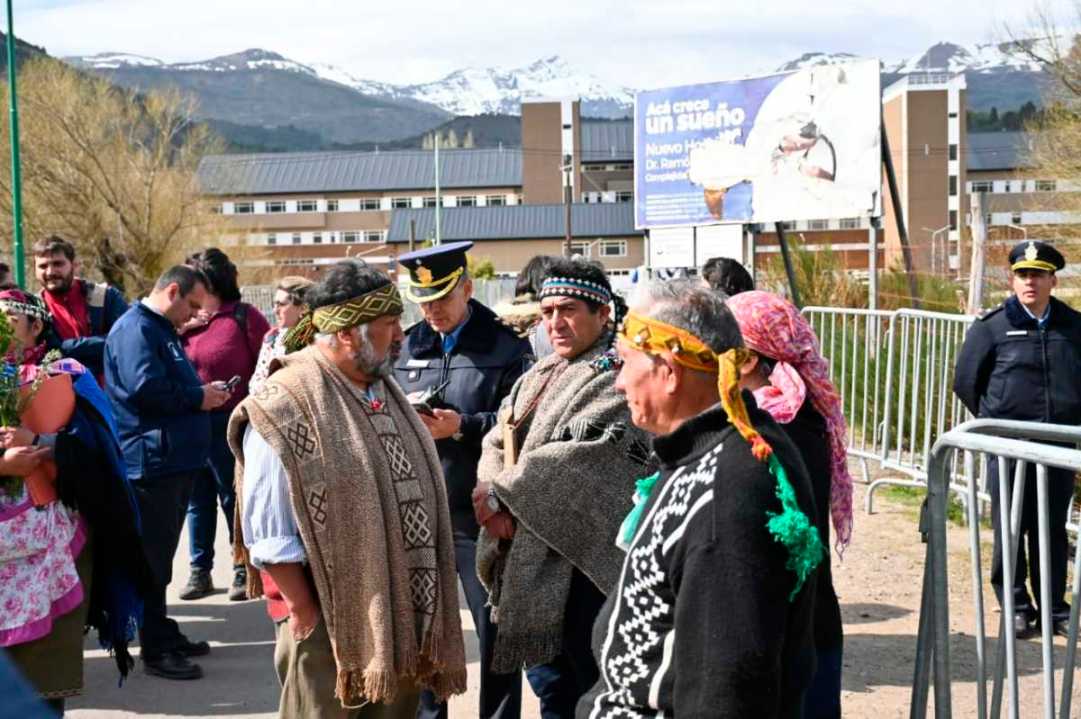 El presidente y los funcionarios recorren el hospital, mientras los referentes mapuches lo esperan en la zona de los invitados. Se espera que en breve empiece el acto.