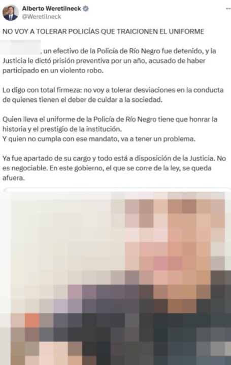 Pese a lo que dispuso la Justicia, en su cuenta de X, el gobernador de Río Negro, Alberto Weretilneck, difundió una imagen del único imputado del caso, como así también su nombre y apellido.