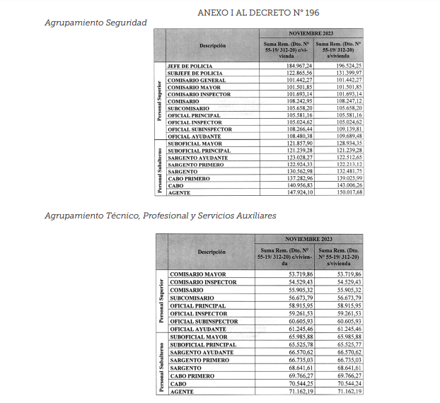En el caso de un rango de Comisario del Agrupamiento Seguridad, el monto quedó igual con o sin vivienda por 108.242,95 pesos; un oficial principal cobrará 105.581,16 de suma fija remunerativa y un oficial ayudante asciende a 108.480,38 pesos con vivienda y 109.689,48 con vivienda.