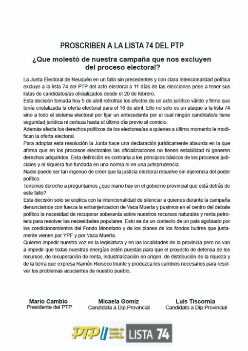 El Partido del Trabajo y del Pueblo (PTP) denunció proscripción en las elecciones 2023 de Neuquén porque bajaron su lista, la 74, colectora de Ramón Rioseco. Los candidatos repudiaron el accionar de la Junta Electoral, a menos de dos semanas de las elecciones provinciales del 16 de abril: «¿Qué mano hay en el gobierno provincial que está detrás de este fallo?».