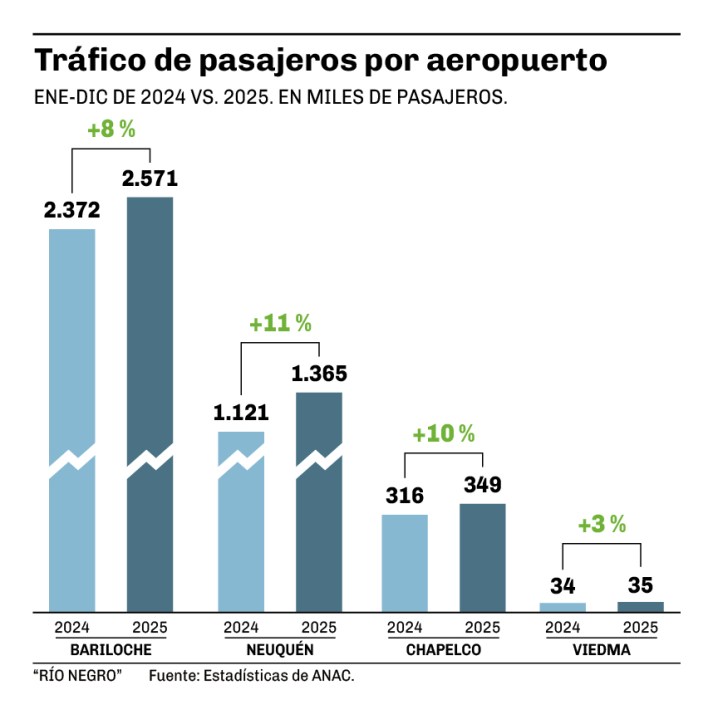 La provincia de Neuquén tiene dos aeropuertos activos con movimiento creciente. En el 2025 la pista de la capital tuvo un 11% más de pasajeros respecto del año anterior y llegó a 1.365.000 viajeros, entre arribos y partidas.